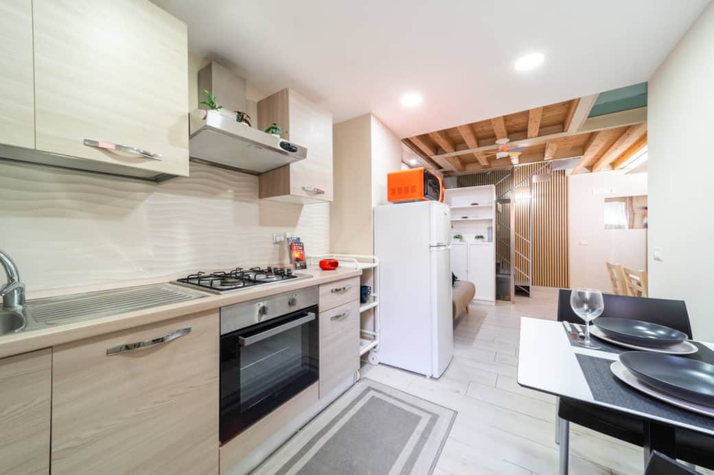 Coffee machine, Cooking utensils, Kitchen stove, Kitchenette, Microwave, Oven, Refrigerator